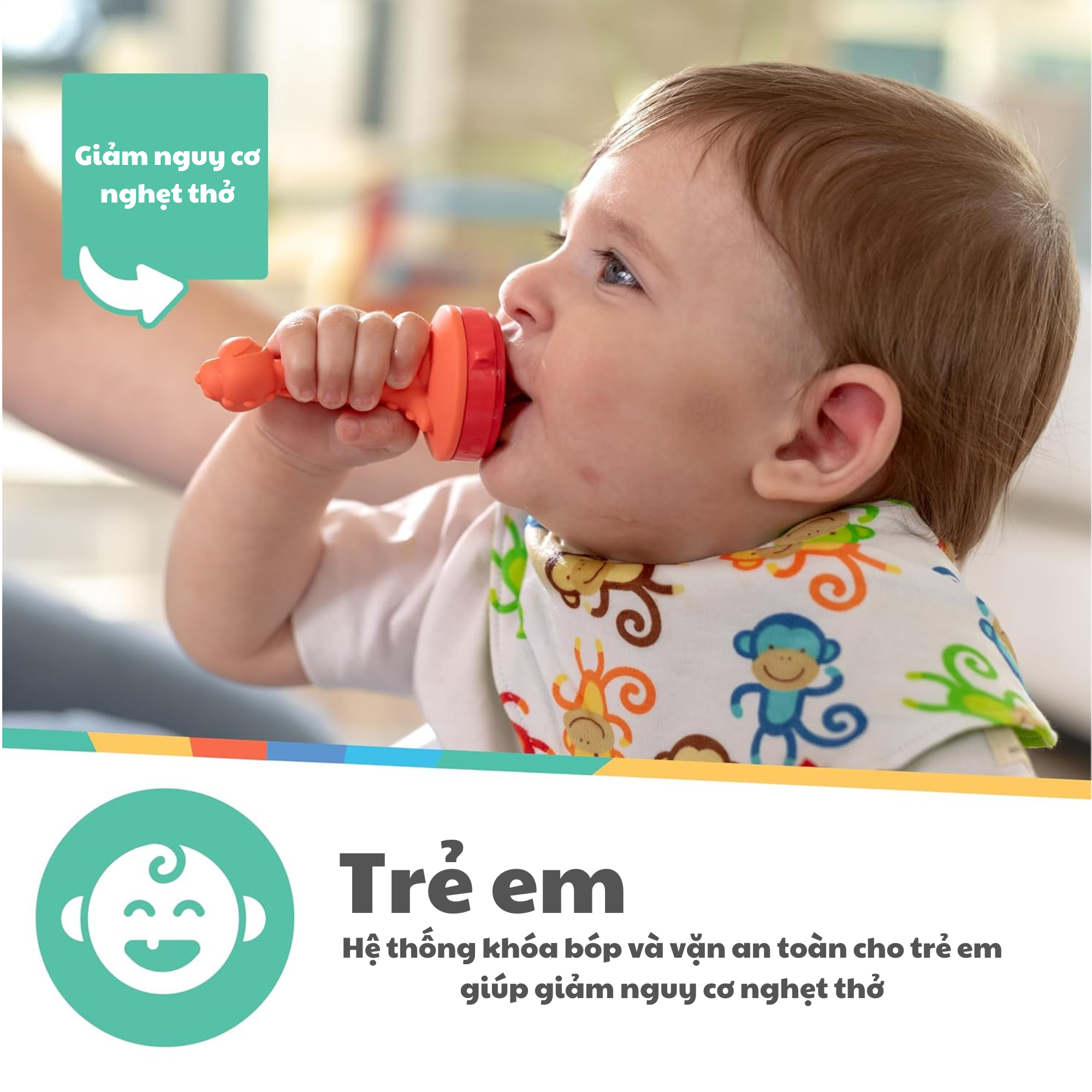 | Dành cho bé từ 10 tháng tuổi trở lên – Hỗ trợ bé làm quen với thực phẩm mới một cách an toàn Giảm khó chịu khi mọc răng – Silicone mềm giúp bé nhai gặm thoải mái, làm dịu nướu hiệu quả Núm silicone an toàn thực phẩm – Có thể tháo rời để vệ sinh dễ dàng, không chứa BPA Khóa an toàn chống bé mở nắp – Thiết kế thông minh giúp bảo vệ bé khỏi nguy cơ hóc dị vật Tay cầm hình thú dễ thương – Dễ cầm nắm, tạo hứng thú cho bé khi ăn Dễ vệ sinh – Có thể rửa bằng máy rửa chén (ngăn trên)